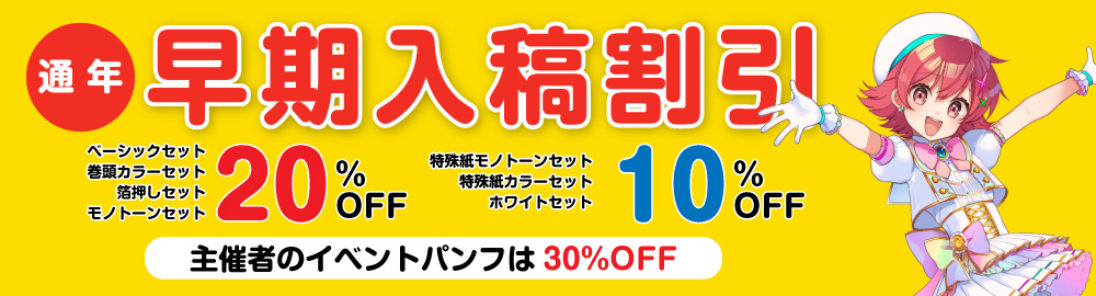 締切に合わせてご注文いただいた同人誌セットを30%割引!!ただし、バリュープライスのVALUEセット、ぷちっとセットは対象外。例外的にノベルセット、オールカラー、6色表紙セットは15%割引を適用できます。皆様にとって集大成となる総集編や記念本。あるいは、普段手の出せなかった特殊装丁をお試しください(セット本体価格のみの割引です)。
