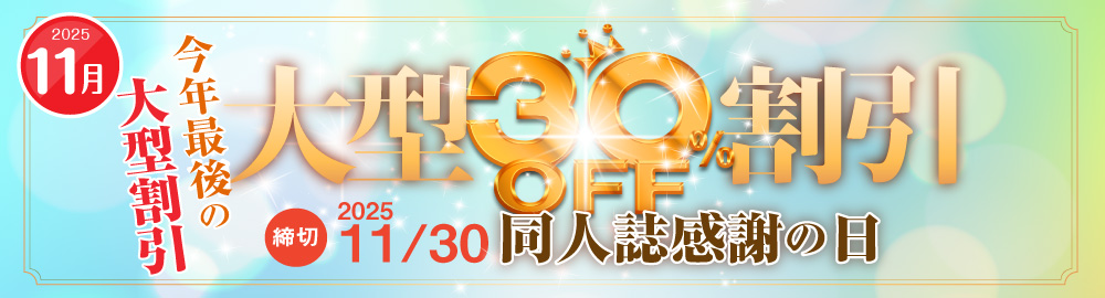 ※注文時のキャンペーン欄で「同人誌感謝の日30%割引」「同人誌感謝の日バリュープライス15%割引」をお選びください。