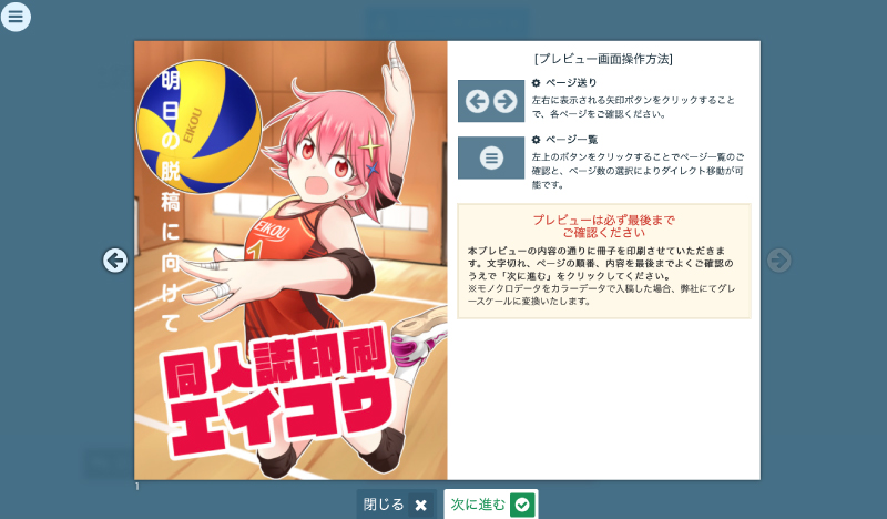 断ち切り状態で表示されますので本文の文字切れやページ順序の確認などを行ってください。確認が終わりましたら画面下の「次へ進む」をクリックしてください。