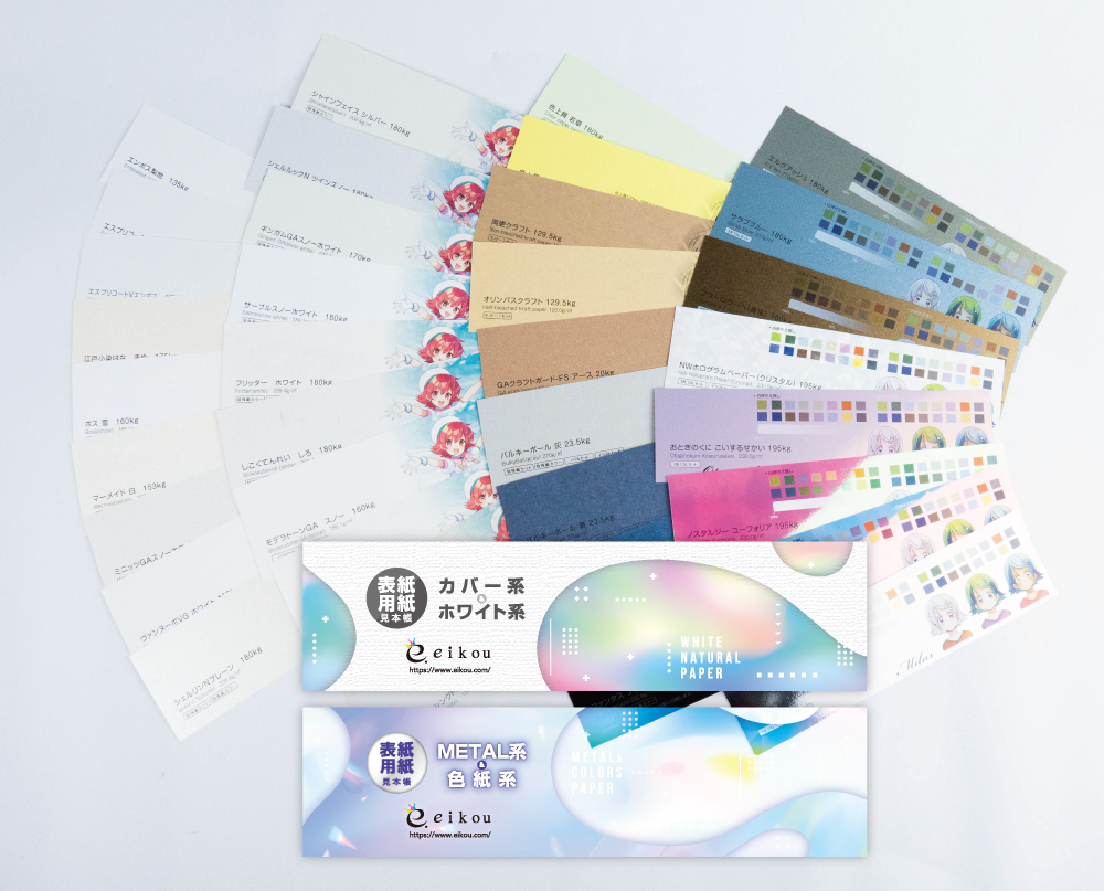 栄光の同人誌セットで使われる表紙用紙の特殊紙見本帳。2冊1セットで送付。